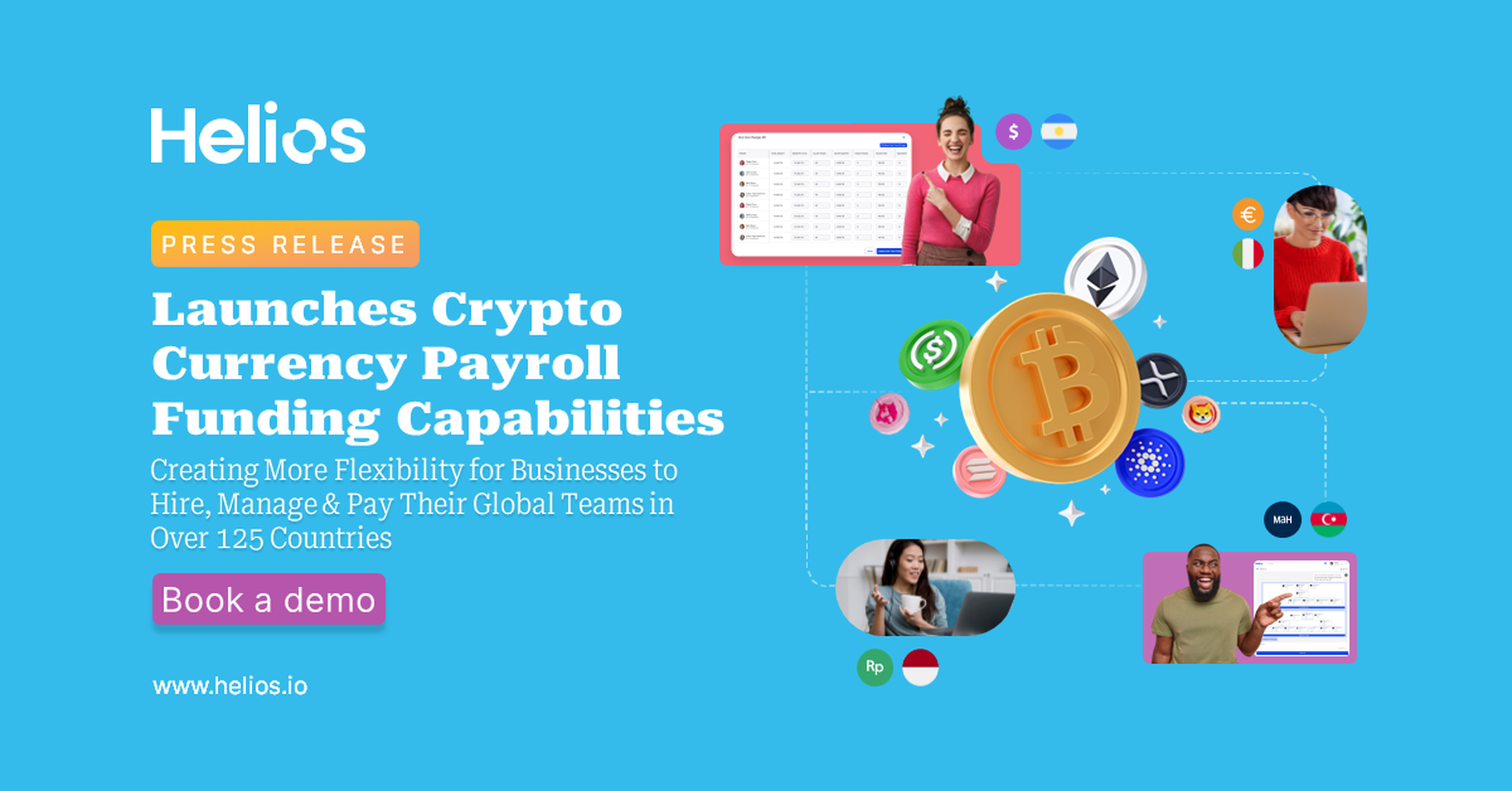 CHICAGO, IL (December 12, 2024) – Helios, a leading global workforce management and payments platform, announces the launch of its cryptocurrency payroll funding solution in January 2025. The wallet-agnostic system supports the top 17 cryptocurrencies, empowering businesses to fund global payroll and payment requirements using crypto further reinforcing Helios’ leadership in enabling flexibility within its workforce management and payments solution.